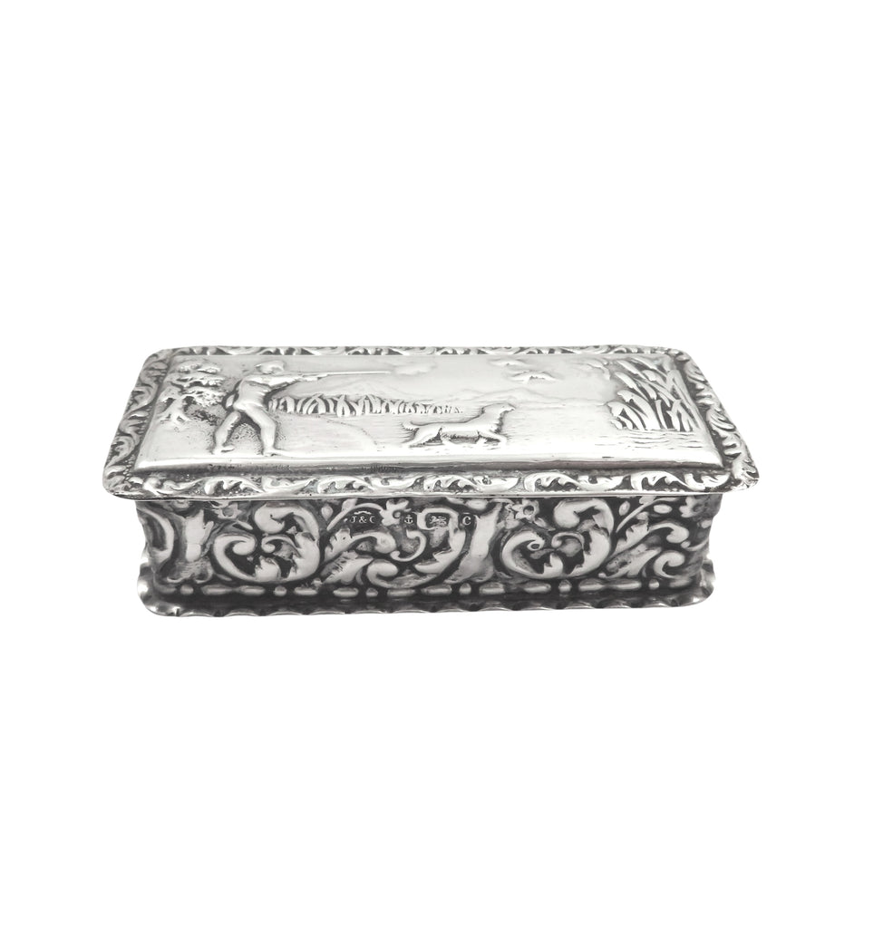 Antique Edwardian Sterling Silver Trinket Box with Hunting Scene 1902