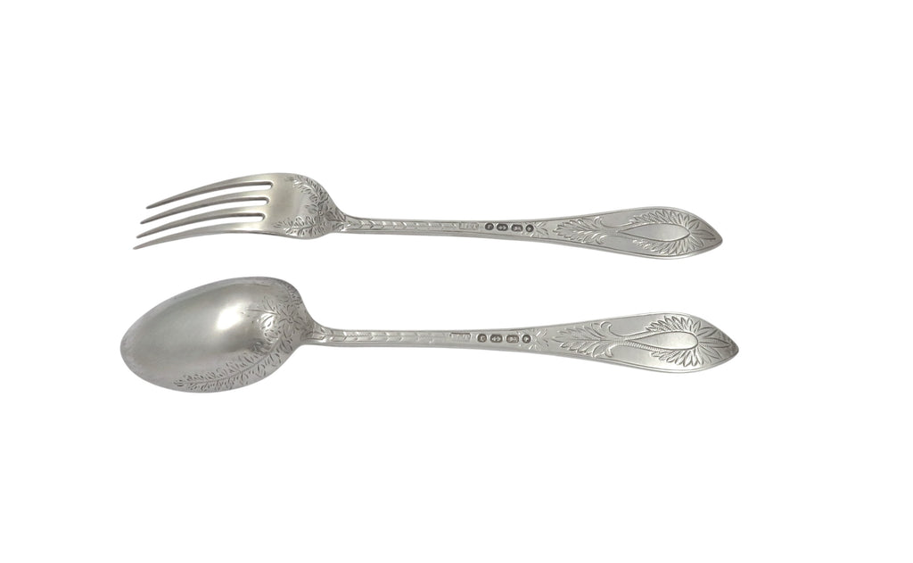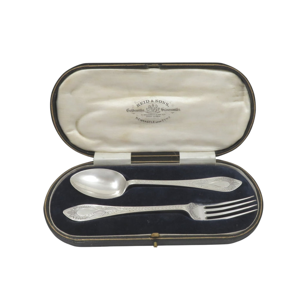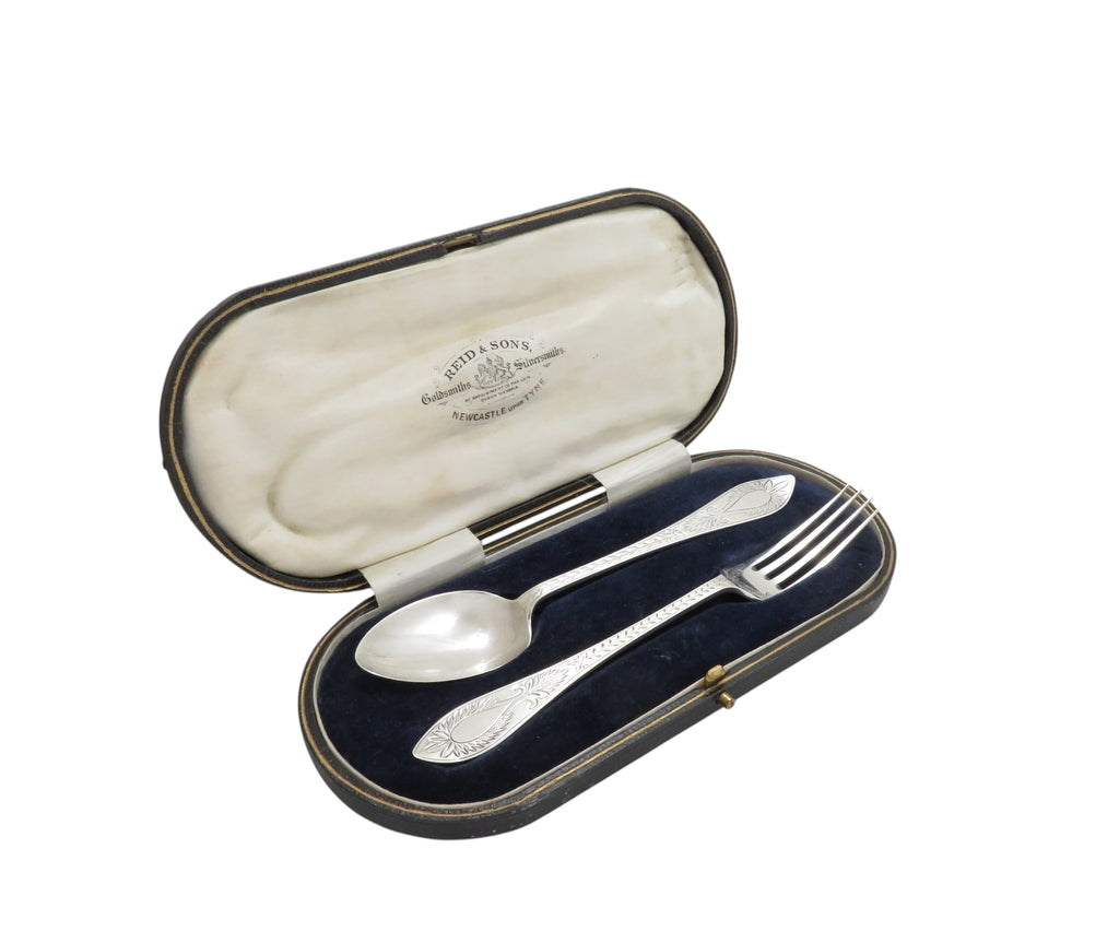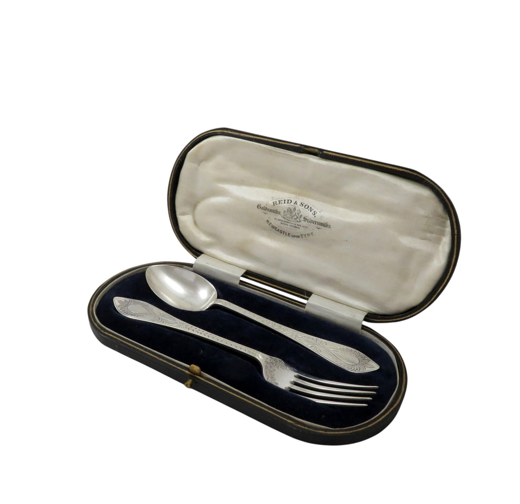 Antique Victorian Sterling Silver Christening Spoon & Fork in Case 1877