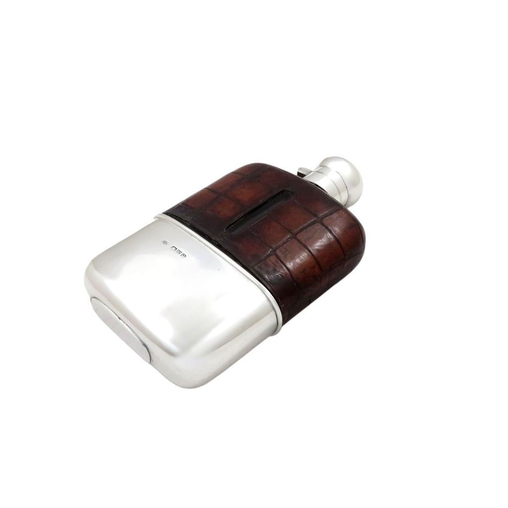 Antique Victorian Sterling Silver & Crocodile Leather 6" Hip Flask 1899