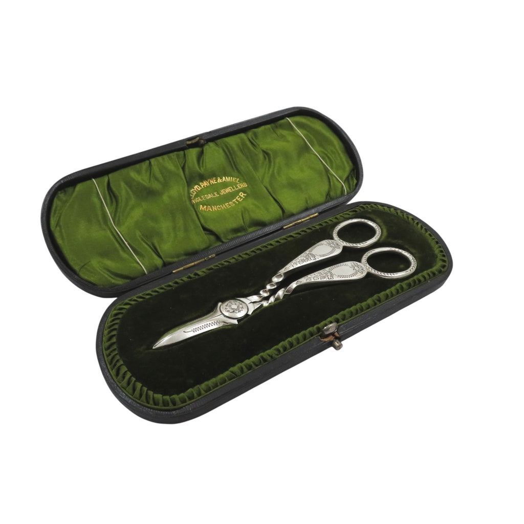 Pair of Antique Victorian Sterling Silver Grape Shears / Scissors in Case 1899