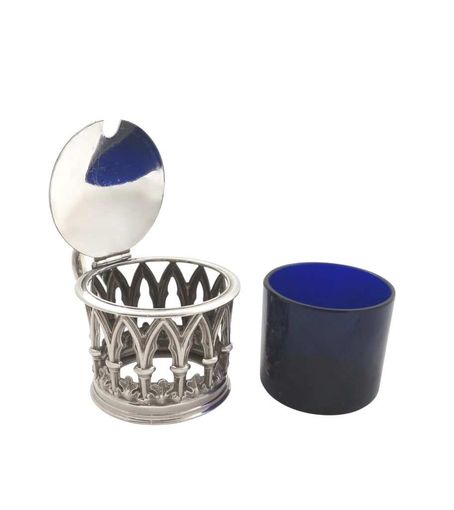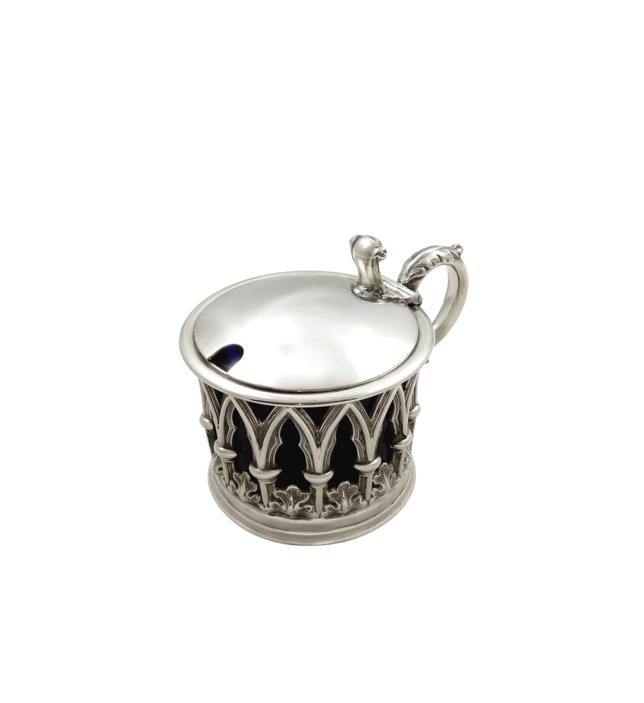 This is a lovely antique early Victorian sterling silver mustard pot in a gothic style measuring 4" (10 cms) across including the handle x 2 3/4" (7 cms) wide x just over 2" (5 cms) tall to the lid.