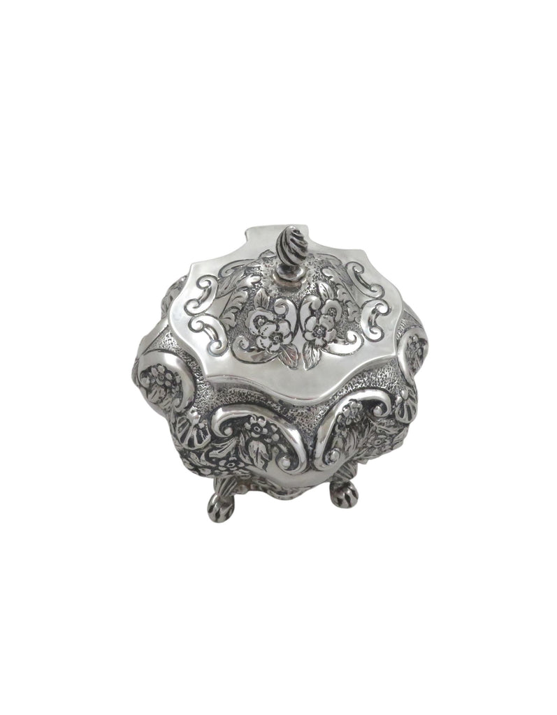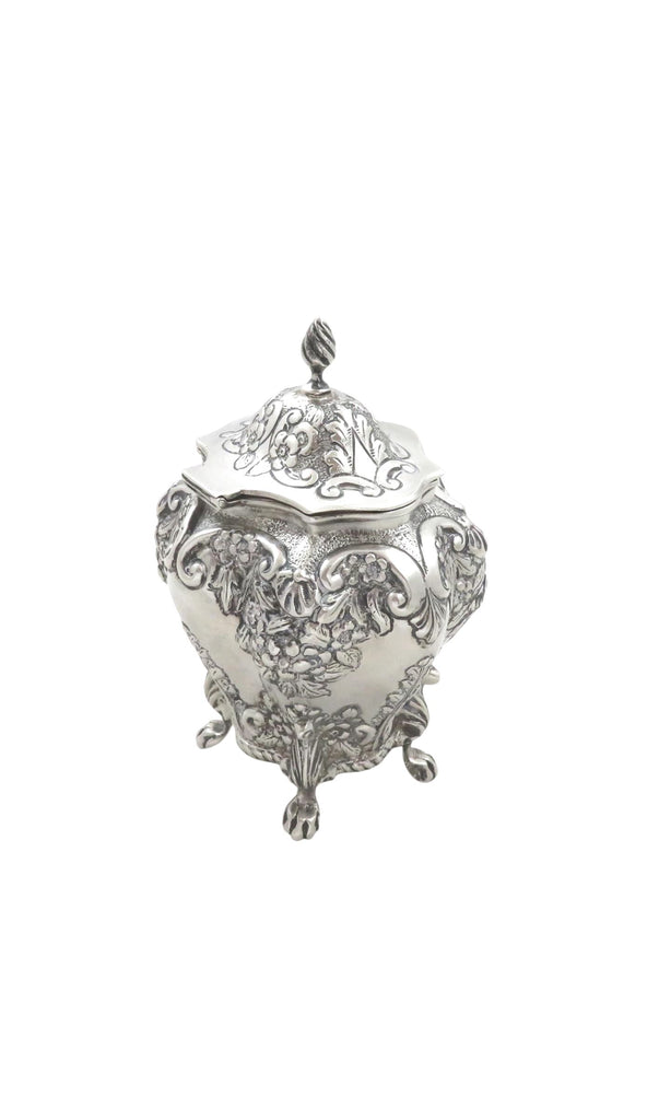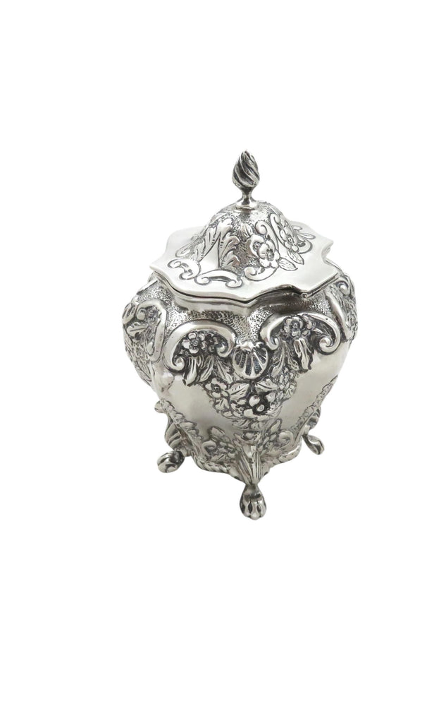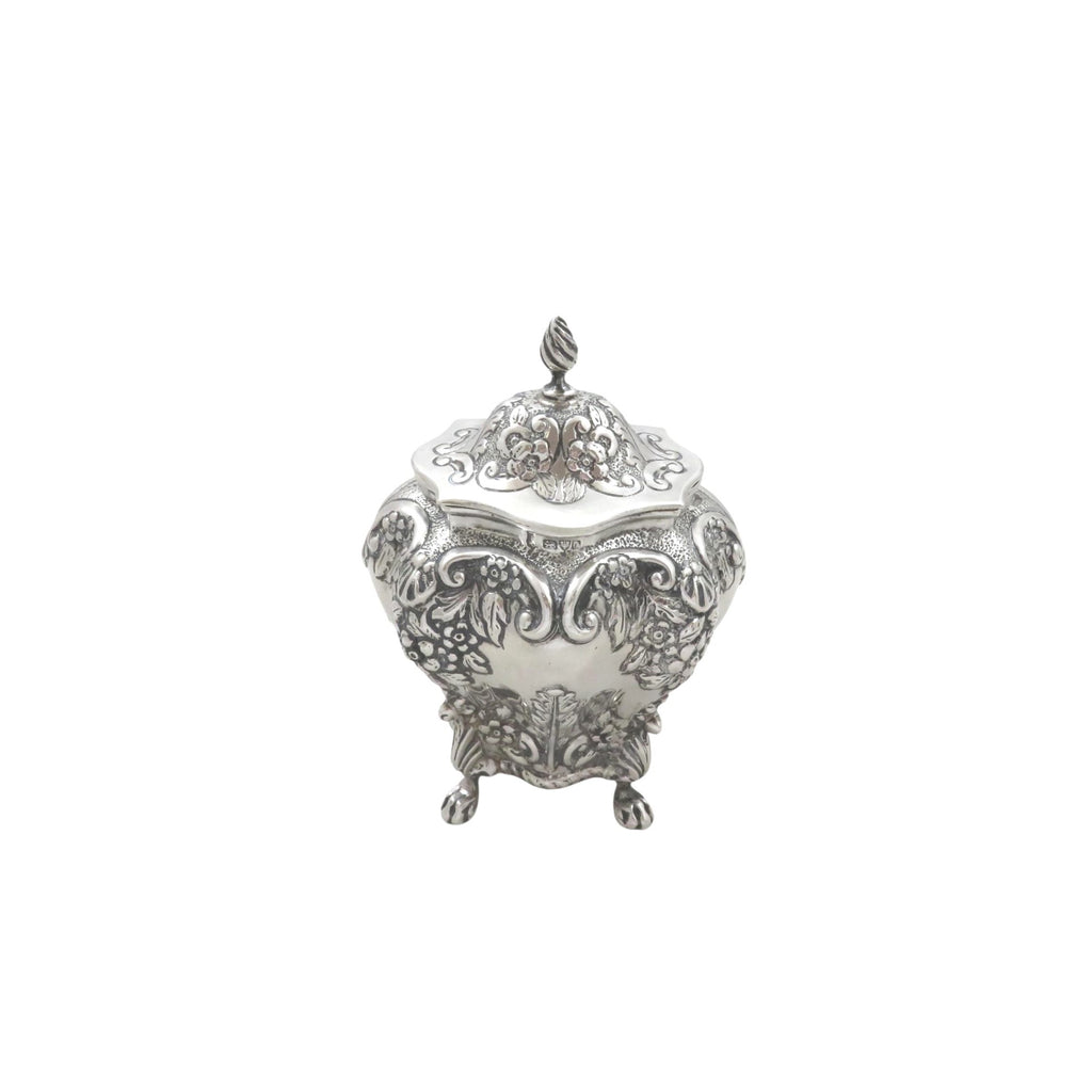 This is a lovely antique Edwardian sterling silver caddy with hinged lid measuring 5" (12.5 cms) tall x 3 1/4" (8.5 cms) across x 3 1/4" (8.5 cms).