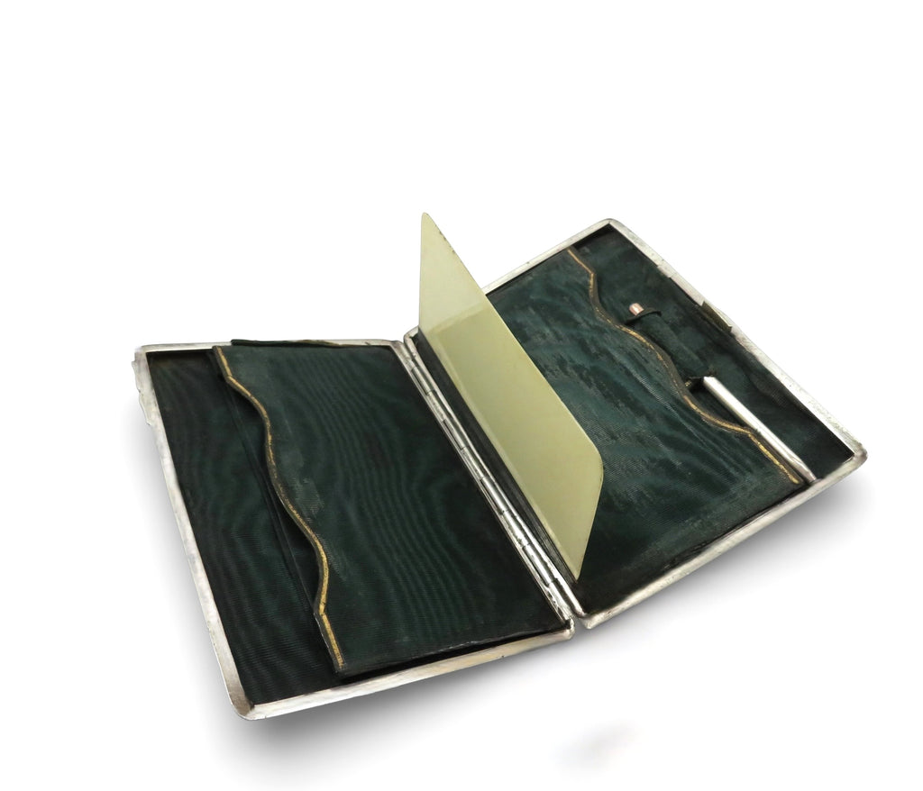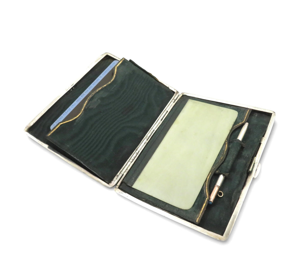 This is a superb antique late Victorian sterling silver card case/aide memoir measuring 4" (10 cms) x 3" (7.5 cms) and hallmarked for Birmingham 1900 with the silversmiths mark for Henry Matthews