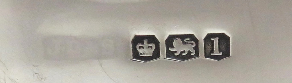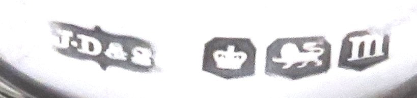 The lid is hallmarked for Sheffield 1929 and the cup is Sheffield 1928 with the silversmiths mark for James Dixon & Sons and underneath it shows the retailers mark 'Bristol Goldsmiths Alliance' 3/16 pint.