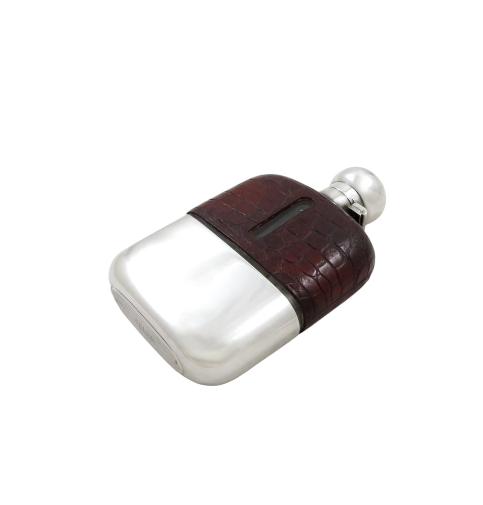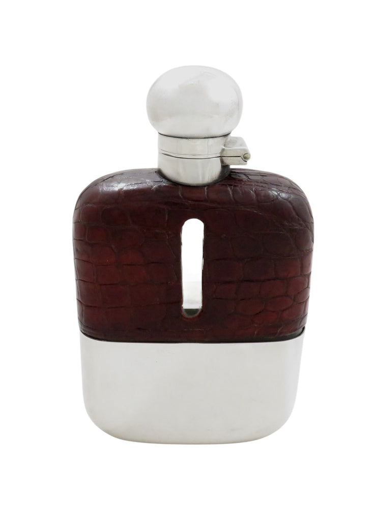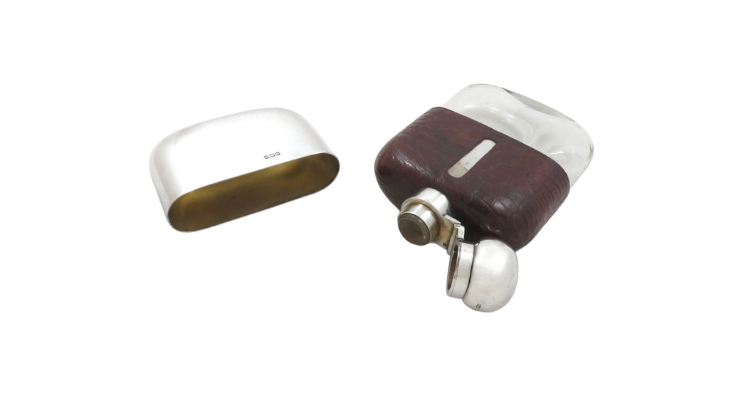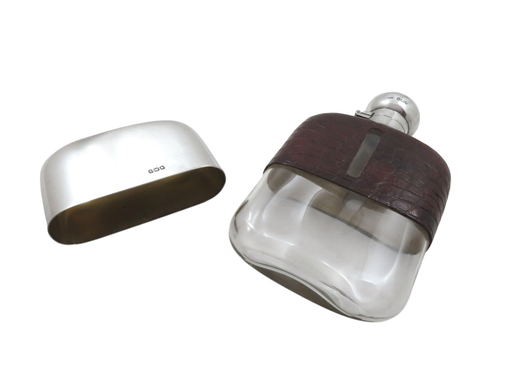 Antique Sterling Silver & Crocodile Leather 5" Hip Flask 1929