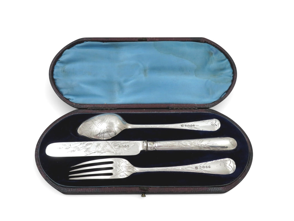 This is a superb antique Victorian sterling silver 3 piece cutlery Christening set in the original presentation case.