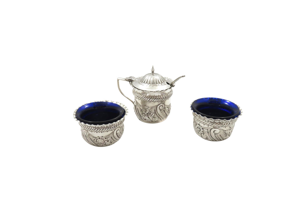 All items have the silversmiths mark for George Jackson & David Fullerton, the mustard is hallmarked for London 1900 and the salts are London 1898 & 1899