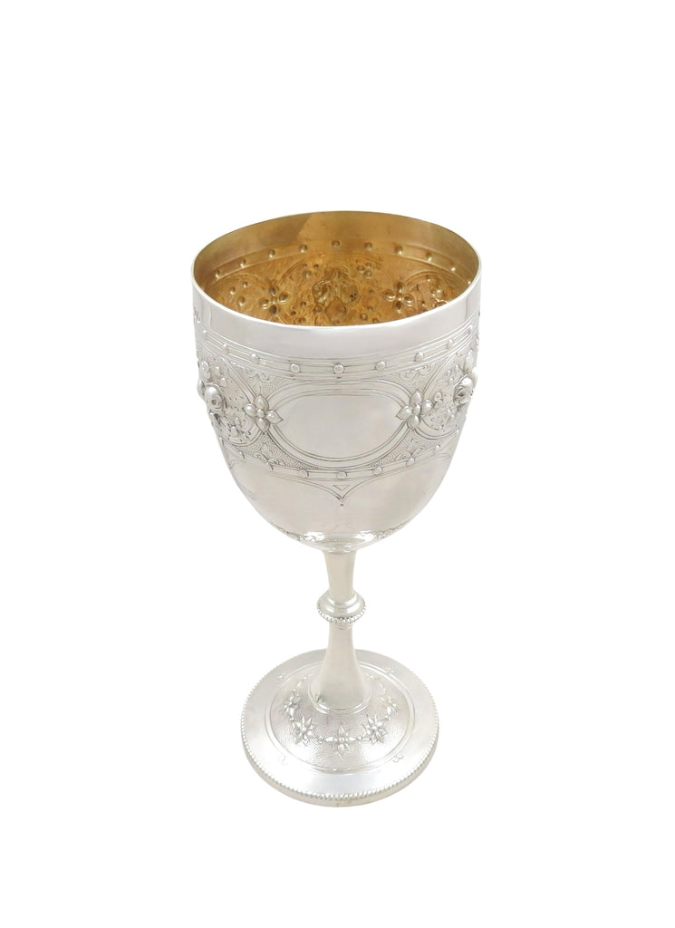 This is a superb antique Victorian sterling silver goblet measuring 7 3/4" (19.5 cms) tall x 3 1/2" (9 cms) across the top.