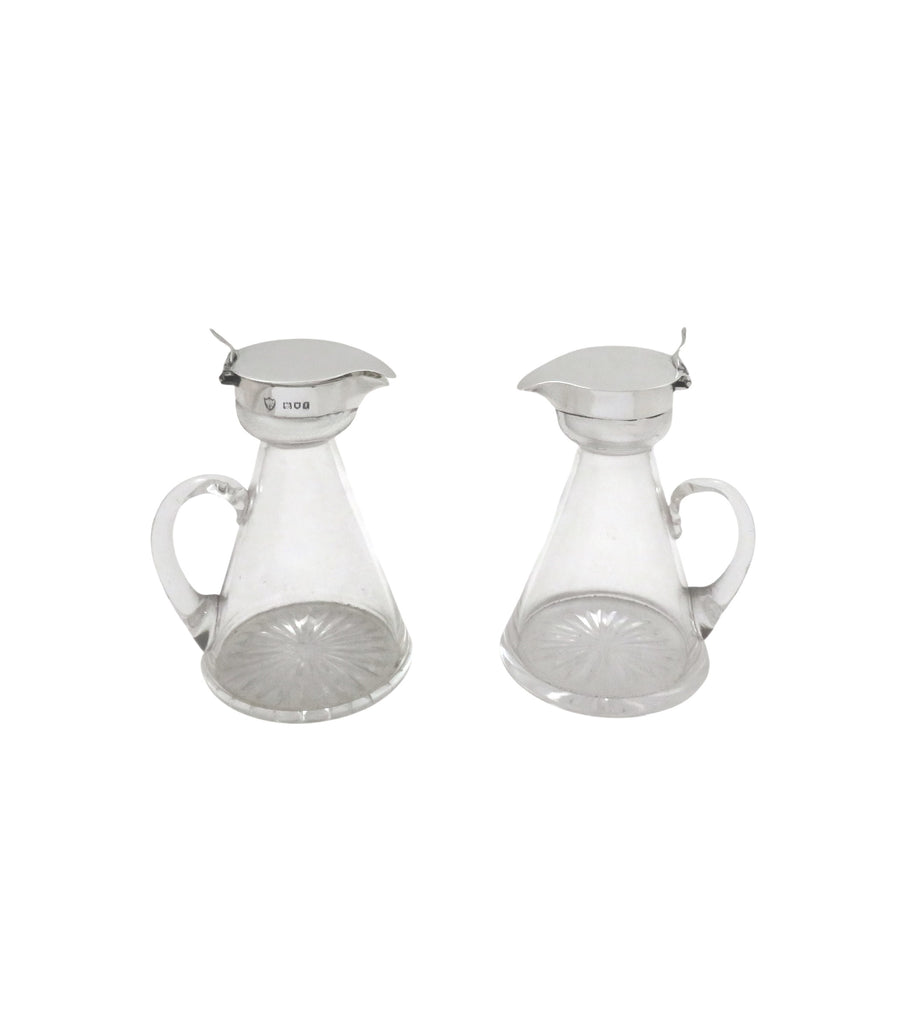 This is super pair of antique George V sterling silver and glass whisky noggins/jugs each with a curved handle and silver collar with thumb rest for opening the lid.