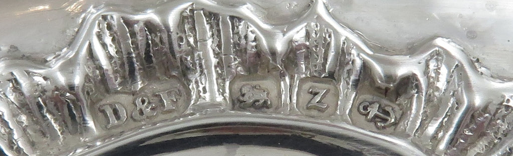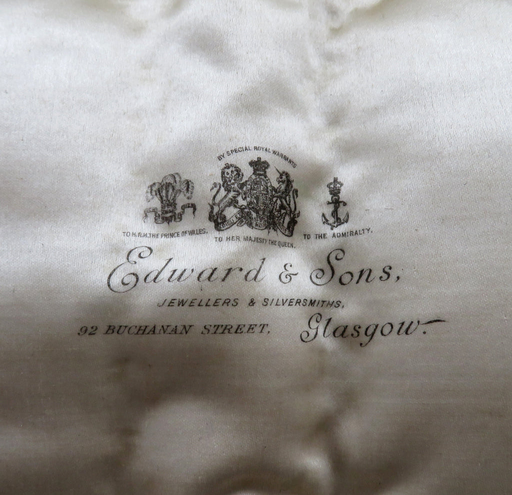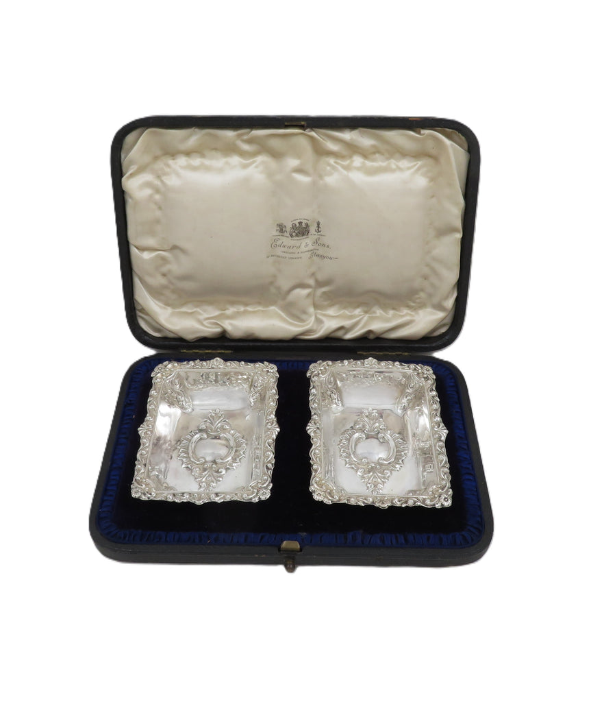 The dishes each measure 4 1/4" (11 cms) x 3" (8 cms) x 1" (2.5 cms) and have matching hallmarks for Birmingham 1899 with the silversmiths mark for Deakin & Francis and the inside of the case shows the retailers mark for Edward & Sons of 92, Buchanan St, Glasgow.