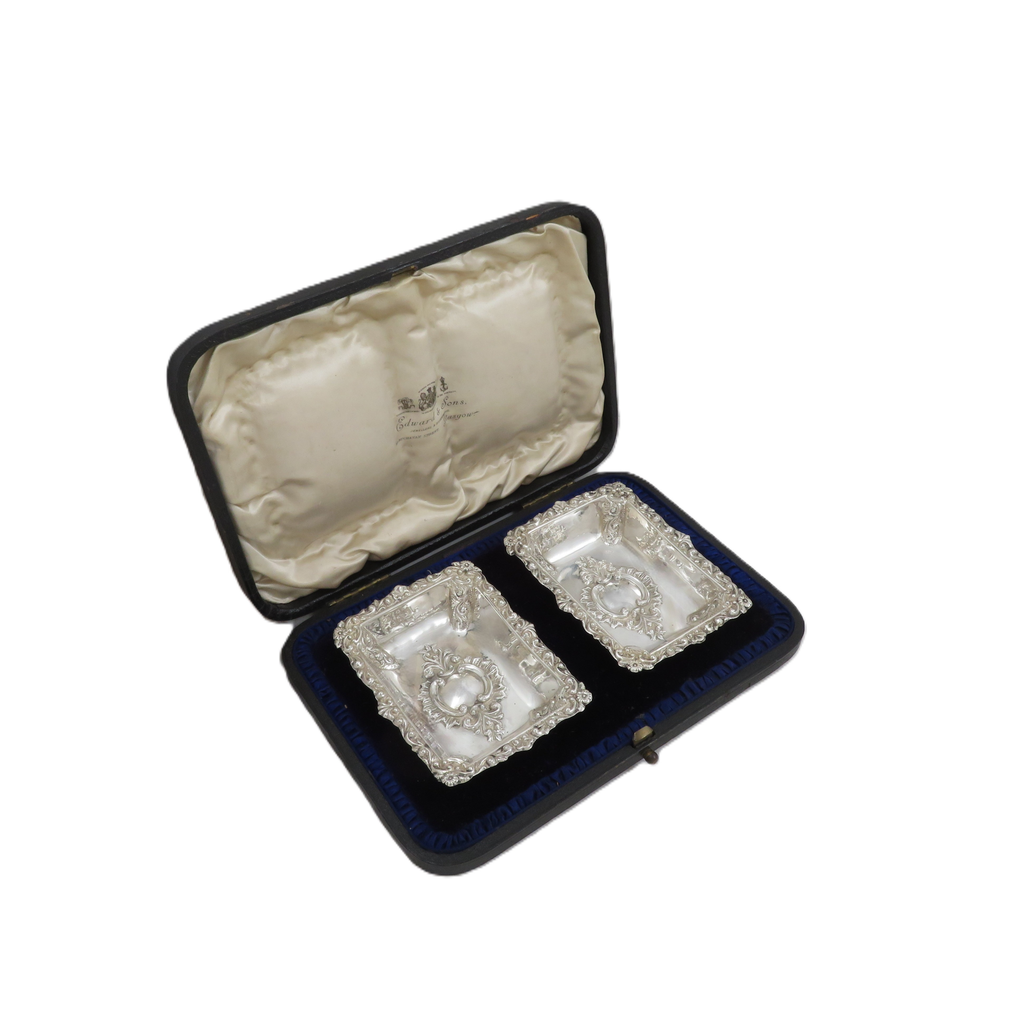 This is a super pair of antique Victorian hallmarked sterling silver dishes in their original presentation case.