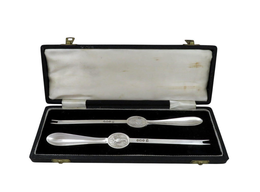 This is a super pair of vintage sterling silver lobster picks in their original case.